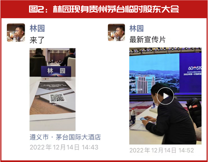 12月14日,贵州茅台在茅台镇公司总部召开了本年度第一次临时股东大会,身为其大股东的私募大佬林园也是亲自莅临现场,并在朋友圈发布了现场的照片与视频(见图2)。