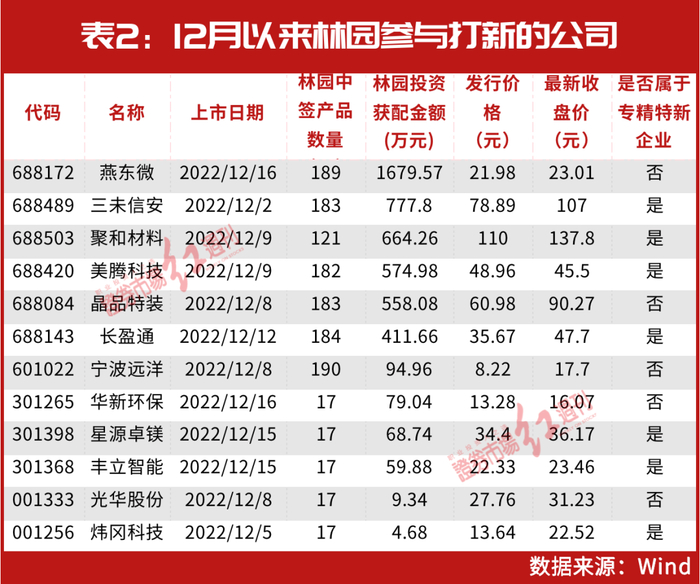 除了对长期看好的公司持续持有,近年来,林园参与打新的积极性也一直很高。对此,《红周刊》曾刊发《林园最新建仓股曝光!押中这只“翻倍牛”爆赚600万,“秘诀”是……》、《林园11月买进4家公司,“熊市”满仓策略仍在持续)》、《林园再出手,两周买进12家公司!这些朝阳产业隐形冠军是首选》等多篇文章进行跟踪报道。而就在本月,在34只上市新股中,林园也再次成功参与了其中12家公司的打新配售。
