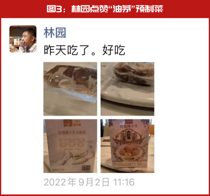 而在今年9月,林园还曾亲自为“油茅”推出的预制菜“打Call”,在朋友圈公开表示菜品好吃。且在动态的留言处,有好友点赞留言称他为“中华好股东”(见图3)。