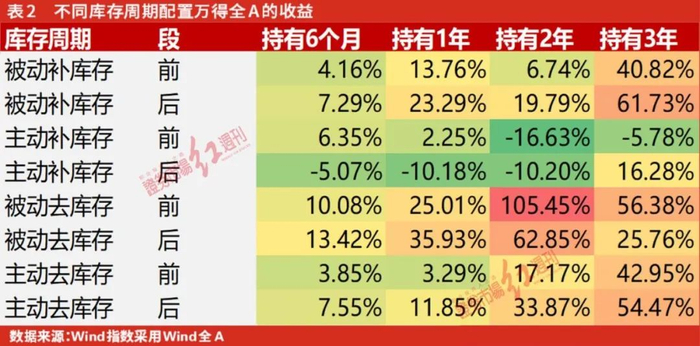 而当我们进一步去思考在库存周期不同阶段去配置权益市场有何不同效果时,得到了以下的表格的结论。