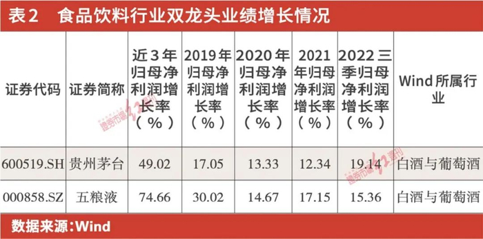 实际上,食品饮料行业已经形成贵州茅台和五粮液双龙头格局。以2022年三季报归母净利润情况看,贵州茅台一家的归母净利润就占了全行业的三分之一,而最新的年报预告显示,其预计实现归属于上市公司股东的净利润达626亿元左右,同比增长19.33%左右。而且,即便是有三年疫情扰动,这两家公司业绩增长仍维持在双位数(见表2)。