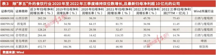 在食品饮料行业,除了茅台和五粮液双龙头以外,其他公司2020年以来维持双位数增长的公司也达到6家(见表3)。