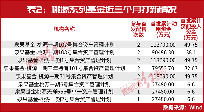 早在2022年7月,泉果基金的首只产品、由王国斌担任基金经理的桃源一期基金发售,在打新方面,王国斌的桃源系基金也积极参与其中。统计显示,最近三个月当中,桃源系基金共参与了多笔打新,首发累计动用资金近60亿元,累计获配投入资金约为240 万元。其中,桃源一期31号、泉果基金-桃源一期107号以及桃源一期1号获配金额较高,均为49.75万元(见表2)。