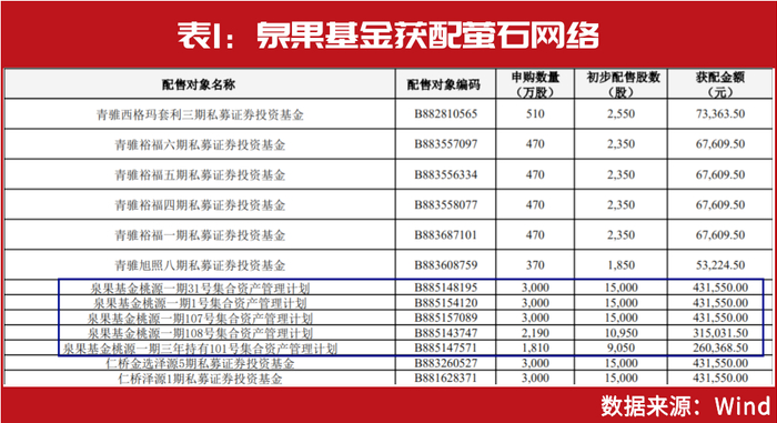 据萤石网络2022年12月20日发布的网下配售结果显示,泉果基金旗下有5只产品获配,分别为泉果基金桃源一期31号、泉果基金桃源一期1号、泉果基金桃源一期107号、泉果基金桃源一期108号、泉果基金桃源一期三年持有101号。初步来看,上述5只基金共获配金额为187.02万元(见表1)。