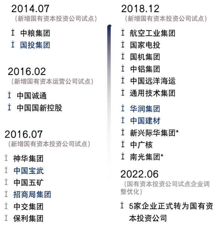 *注:根据2022年6月发布的《关于国有资本投资公司改革有关事项的通知》,新兴际华集团与南光集团两家央企已不在国有资本投资公司试点之列