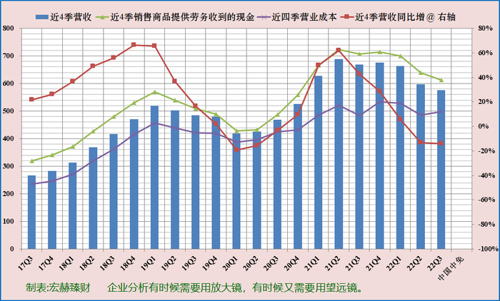 绿色折线接近或高于蓝色柱图上边显示营业收入含金量高。