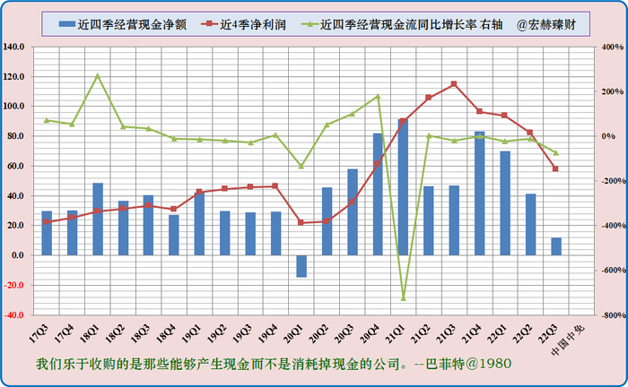 蓝色柱图持续在红色折线上面显示净利润含金量较高。