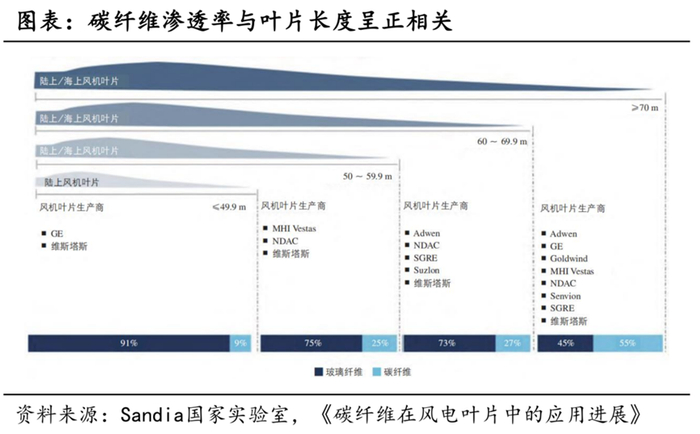 由于风机大型化是未来的发展趋势,叶片长度的增加,也对增强材料的强度和刚度等性能提出了新的要求,玻璃纤维在大型复合材料叶片制造中逐渐显现出性能方面的不足。为了保证在极端风载下叶尖不碰塔架,叶片必须具有足够的刚度。在叶片产品升级过程中,既要减轻叶片的重量,又要满足强度与刚度要求,碳纤维的替代作用愈发凸显。