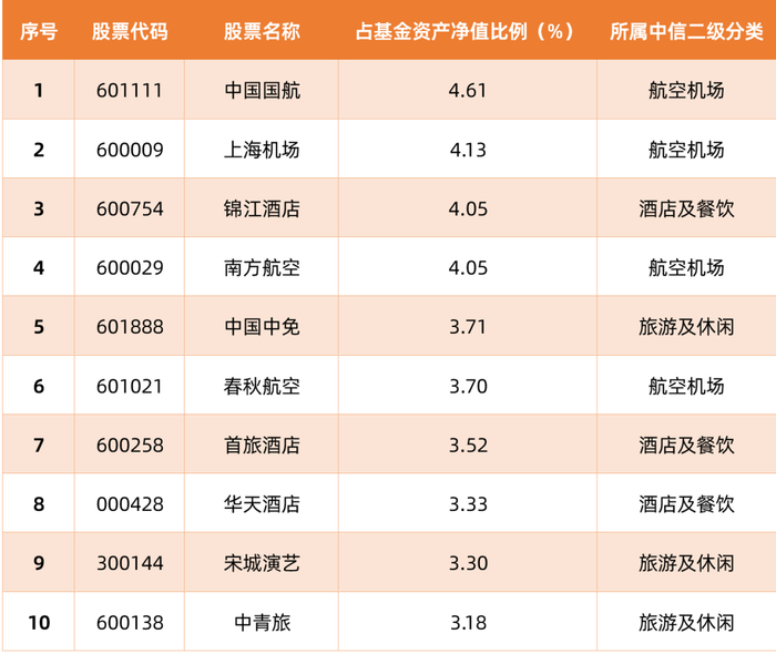 前十大重仓股所属中信二级行业均为航空机场、旅游及休闲、酒店及餐饮,合计占比近40%。
