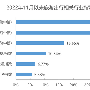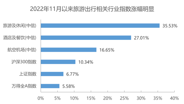 2022年11月以来,与旅游出行相关的旅游及休闲(中信)、酒店及餐饮(中信)、航空机场(中信)指数均呈现较为明显的上涨趋势。其中,旅游及休闲更是以35.53%的涨幅位居109个中信二级行业的第二名。