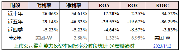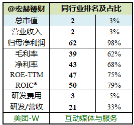 美团 当前时点位居行业百分位参考:总市值3%,毛利率62%;投入资本回报率ROIC:---%;净资产收益率ROE:---%。亏损型互联网企业模式较为特殊。