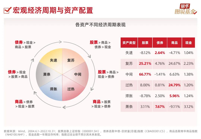 6、宏观经济周期作为市场运行的大背景,在普林格经济周期的不同阶段,各类投资品也会呈现出不同的表现及周期轮回。