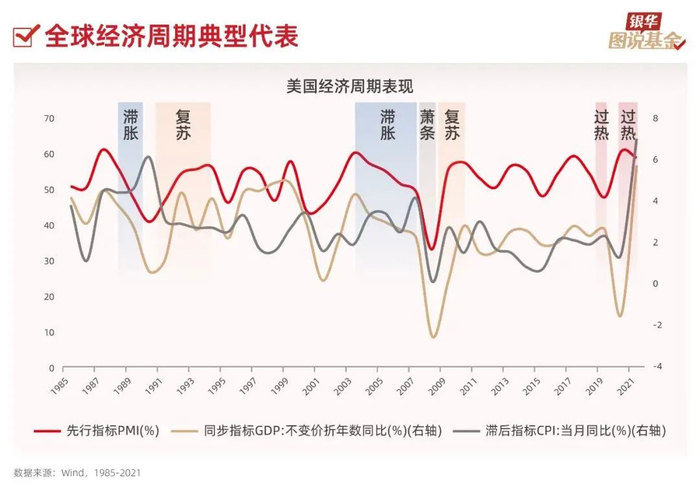 4、就像季节变换总是沿着春、夏、秋、冬的顺序运行,全球经济周期也总是在“复苏、过热、滞胀和萧条”中循环往复。以美国经济周期表现为例,反应经济景气程度的PMI指数呈现出明显的峰谷交替。