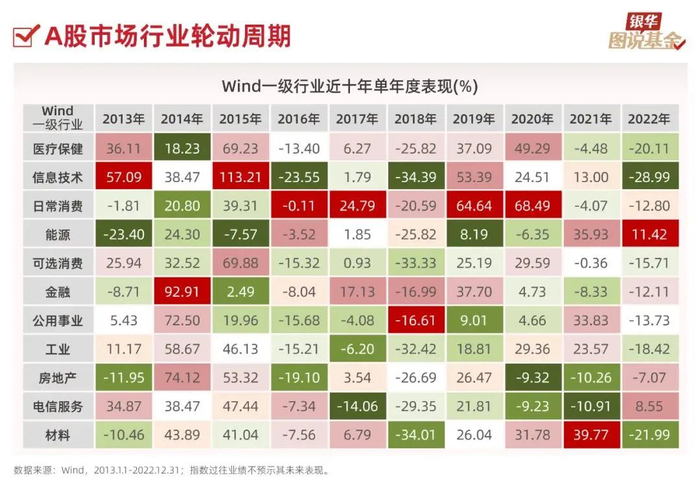 11、A股市场,不同行业板块之间涨跌幅呈现此起彼伏的状态。以Wind行业一级指数为例,近十年中任意单一行业都难以持续性地领跑市场,同时,伴随着轮动速度地加快,各行业周期运行也存在着差异。