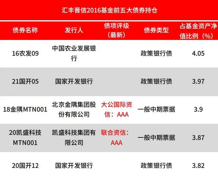 数据来源:汇丰晋信定期报告,截至2022年12月31日,定期报告中各季度末显示的前五名债券投资明细仅为季度末当天持有的情况,不代表基金在完整季度始终持有或未来仍继续持有。债项评级数据来源于Wind,大公国际资信对于18金隅MTN001的债项评级发布于2022.4.26,联合资信对于20凯盛科技MTN001的债项评级发布于2022.6.28。仅供示意用途,不作为投资建议,市场有风险,投资需谨慎。