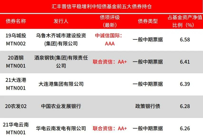 数据来源:汇丰晋信定期报告,截至2022年12月31日,定期报告中各季度末显示的前五名债券投资明细仅为季度末当天持有的情况,不代表基金在完整季度始终持有或未来仍继续持有。债项评级数据来源于Wind,中诚信国际对于19乌城投MTN002的债项评级发布于2022.6.28,联合资信对于20酒钢MTN001的债项评级发布于2022.7.27,联合资信对于21华电云南MTN001的债项评级发布于2022.7.22,21大连港MTN001无债项评级,中诚信国际对其主体评级为AAA,发布于2022.7.26。仅供示意用途,不作为投资建议,市场有风险,投资需谨慎。