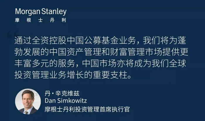 摩根士丹利投资管理首席执行官丹·辛克维兹(Dan Simkowitz)表示:“通过全资控股中国公募基金业务,我们将为蓬勃发展的中国资产管理和财富管理市场提供更丰富多元的服务,中国市场亦将成为我们全球投资管理业务增长的重要支柱。随着进一步加大在华投入,我们会充分利用逾40年的行业经验,以及在全球开展可持续发展和多元化投资组合管理的专长,帮助国内客户实现投资目标。”