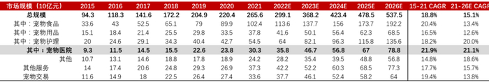 过去几年中国宠物数量高速增长,预计未来几年内将有大量宠物犬猫进入老年期,发病率将会大幅增加,衍生出宠物诊疗需求。沙利文的数据显示,2021年宠物医院市场规模303亿元,占宠物整体市场11.4%,预计21-26年将保持21.1%的复合增长率,高于整体(15.1%)与宠物食品市场(13.4%)增速,是未来增速最快的宠物细分赛道。截至2021年末,中/美两地的每只伴侣宠物年均医疗支出、宠物医疗渗透率和每只伴侣宠物年均看病频次数据分别约为1100/3600元、21%/50%、1.9/3.6次每年,美国分别为中国的3.3倍、2.4倍和1.9倍。随着宠物家庭地位的提升及人宠情感黏性的增强,宠物主对宠物健康关注程度提升,消费意愿增强,宠物医疗渗透率、消费频次和客单价均有望提升。