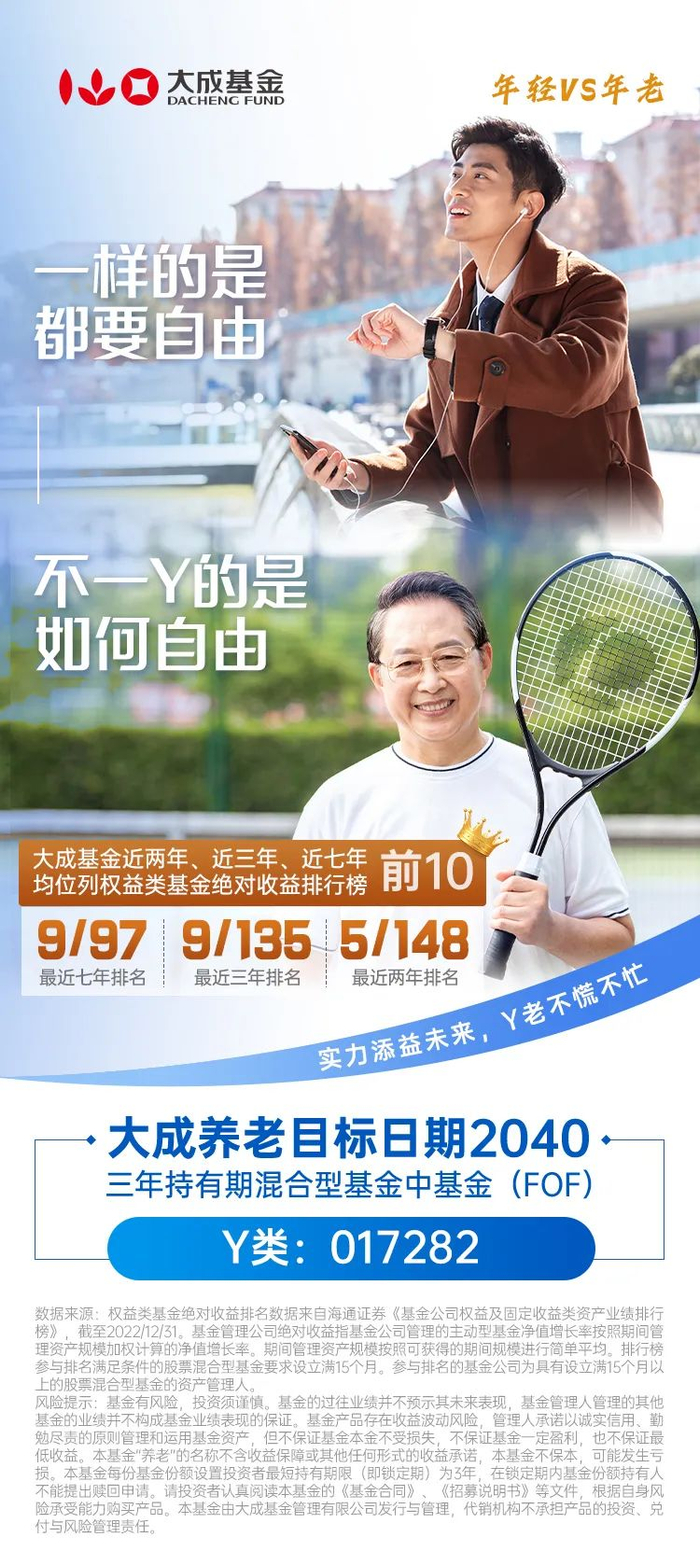 而专门为个人养老金设立的公募基金Y类份额也于去年11月底面世,目前市场上包括大成养老目标日期2040Y在内的养老Y份额基金共计133只。为大家提供了较为丰富的投资选择,投资者可以根据自己的退休年龄和风险承受能力来选择养老目标日期型基金或养老目标风险型基金。