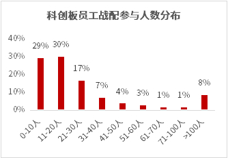 从参与人数上看,员工战配的参与对象需为“高管及核心员工”,因此参与人员更加突出“核心人才,重点激励”的理念。截至2022年12月底,科创板和创业板实施员工战配的企业中,近六成企业的参与人数集中在20人以下。