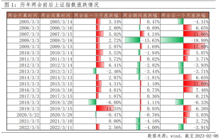 总体来看,两会前政策预期对股市行情有提振作用。2005年以来,两会前一个月、两会期间、两会后一个月上证指数获得正收益的概率分别为83.33%、50.00%、66.67%。除2015、2018、2020年外,上证指数在两会召开前1个月均处于上涨状态,平均涨幅为4.17%,主要源于两会带来的政策预期升温。