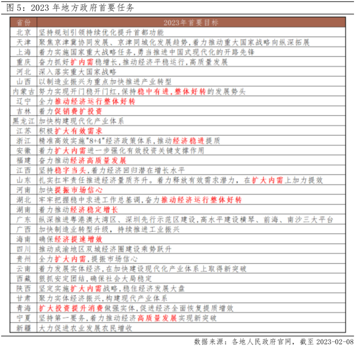 2023年是全面贯彻落实二十大精神的开局之年,也是疫后经济企稳回升的关键之年,今年两会的重要性不言而喻。截至目前,国内31个省市自治区两会均已经召开,以地方两会前瞻全国两会:GDP增速目标方面,相较2022年GDP增速目标,31个省市自治区中21个省份下调,6个省份与2022年目标持平,4个省份上调,中位数在6%,或隐含全国增速目标。首要任务方面,31省市将稳增长列为年度任务,超半数省市将稳增长列为2023重点工作之首,稳增长以促消费扩投资为主要抓手。产业政策方面,关注高端制造和数字经济的发展。