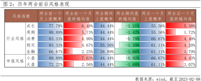 在业绩空窗期、政策预期乐观的环境下,市场风险偏好改善,小盘股表现较好、成长股相对占优。市值风格层面,2005-2022年两会前一个月,巨潮小盘指数的涨跌幅均值为7.63%,上涨概率为88.89%,均高于巨潮大盘指数的涨幅和胜率,小盘股优于大盘股。行业风格层面,2005-2022年两会前一个月,成长风格的涨跌幅均值为6.48%,优于周期、消费和金融风格,但取得正收益的概率不及周期和消费,成长和周期之间需要权衡胜率和赔率。
