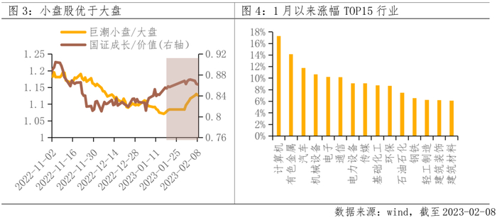 近期小盘股表现已经开始优于大盘,成长风格有望领衔。自1月中旬以来,巨潮小盘指数已持续跑赢巨潮大盘指数,随着国内修复预期逐渐打满、美国软着陆预期增强,外资后续流入预计将逐步放缓,短期内市场风格从大盘转向小盘。此外,在政策预期发酵提振风险偏好的背景下,具备涨跌弹性且小市值成分股较多的成长、周期风格相对占优。从1月以来的市场表现看,领涨行业集中在TMT、高端制造,以及新能源链条相关的有色金属、化工新材料等成长、周期板块。