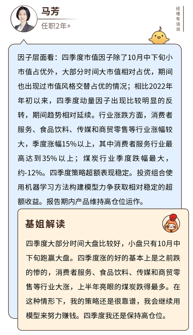 在去年四季报中,马芳提到的投资策略并不多,只是阐述了市场风格的变化以及部分行业的表现。