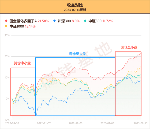 从去年11月至今年1月初,国金量化多因子A又调仓至大盘股,近期应该又调仓买了很多小盘股。