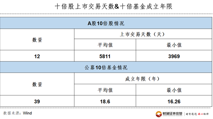 以“十倍股”和“十倍牛基”为例,Wind数据显示,截至2023年2月13日,“A股十倍股”平均上市交易天数为5811天,上市交易天数最小值为3969天,若每年按250个交易日计算,这些十倍股平均上市年限超过23年,最短也接近15年。同样,截至2月10日,“公募十倍牛基”平均成立年限为18.6年,最短的也超过16年。