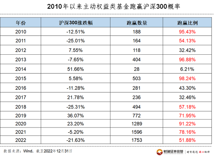 数据统计区间:2010.1.1~2022.12.31;主动权益类基金范围包括普通股票型基金和偏股混合型基金;跑赢比例=投资回报大于等于当年沪深300涨幅的主动权益类基金数量/当年有业绩可查的主动权益类基金总数。指数过往表现不代表未来,中国证券市场成立时间较短,上述展示不能作为任何投资推荐。