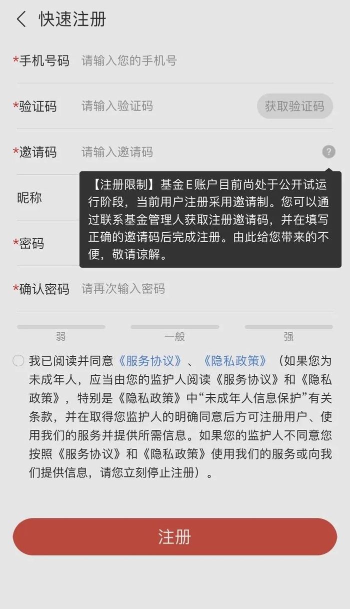 3、基金E账户采用注册邀请制,所以投资者需要先联系公募基金管理人,然后向其获取注册邀请码。试运行初期,每个邀请码可提供注册的用户数量有限。如系统提示您“当前可注册用户名额已用完”时,请您尝试使用其他邀请码。