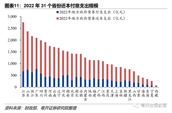 1、从债务规模来看,粤鲁苏浙等经济大省存量债务高。2022年末,债务规模排前五的省份为广东(25082.3亿元)、山东(23588.0亿元)、江苏(20694.1亿元)、浙江(20168.8亿元)和四川(17705.4亿元),分别占地方政府债务总额的7.2%、6.7%、5.9%、5.8%和5.0%。