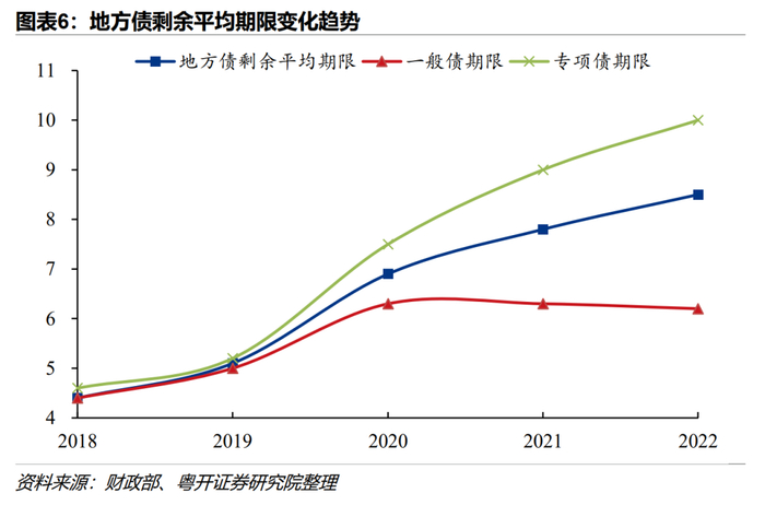 4、地方债特别是专项债的期限明显拉长。从2018年末到2022年末,存量地方债的剩余平均期限从4.4年持续上升至8.5年。其中,专项债剩余期限从2020年开始大幅拉长,2022年末专项债期限首次突破10年。2019年以来,专项债投向范围不断扩容,特别是允许专项债用作重大项目资本金,使得30年超长期限的基础设施专项债发行量激增,拉长了整体债务期限。