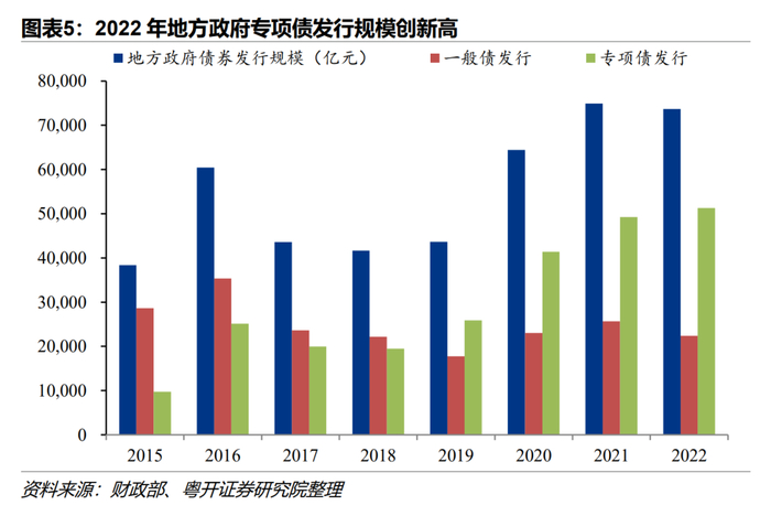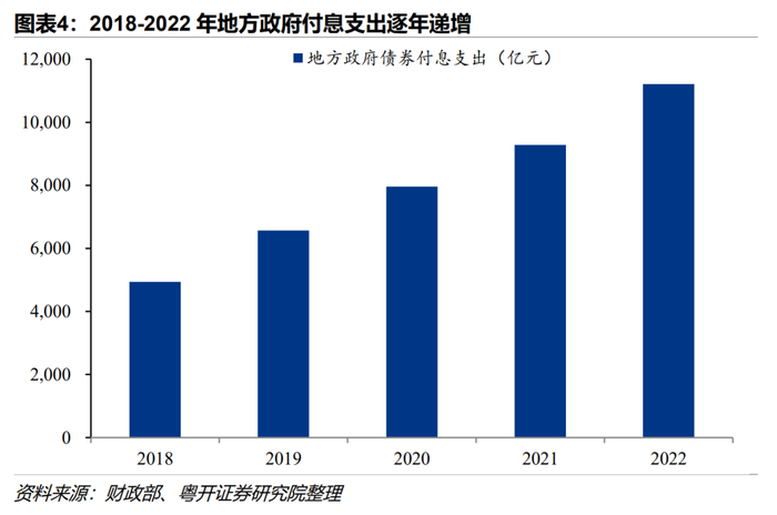3、地方债付息支出激增,专项债发行量大幅扩张。2022年地方政府债券支付利息1.12万亿元,较上年同比增长20.8%,较2018年付息翻了一番,首次突破1万亿元。考虑到地方政府利率并未上升,因而债务规模扩大直接导致了付息支出的激增。近几年存量地方债平均利率基本保持在3.5%左右,2022年平均利率小幅下行至3.39%。2020年疫情爆发后,专项债结存限额被使用,各地专项债发行放量增长。2022年地方政府发行专项债规模首次突破5万亿,创历史新高,较2019年发行规模翻了一番。