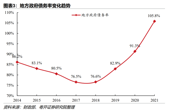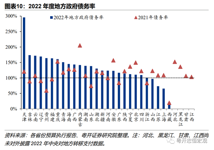 2、考虑经济发展水平以及政府综合财力后,政府债务风险整体可控。衡量政府债务压力主要用负债率、债务率两个指标,负债率=债务余额/GDP,债务率=债务余额/综合财力。其中,地方政府财力不仅包括一般公共预算收入和政府性基金收入,还需考虑中央对地方的转移支付。2022年地方层面财政收支及债务余额数据已基本公布,但中央对各地的转移支付数据仍未公布,债务率指标仍使用2021年数据。截至2022年末,地方政府负债率为29.1%,加上中央政府国债之后,政府负债率合计50.1%,均低于国际通行警戒值,政府债务与经济增长较风险总体可控。2021年末地方政府债务率为105.8%,首次超过100%,主因地方政府财力不足,面临收入压力、支出刚性和举债收紧的三重困难。