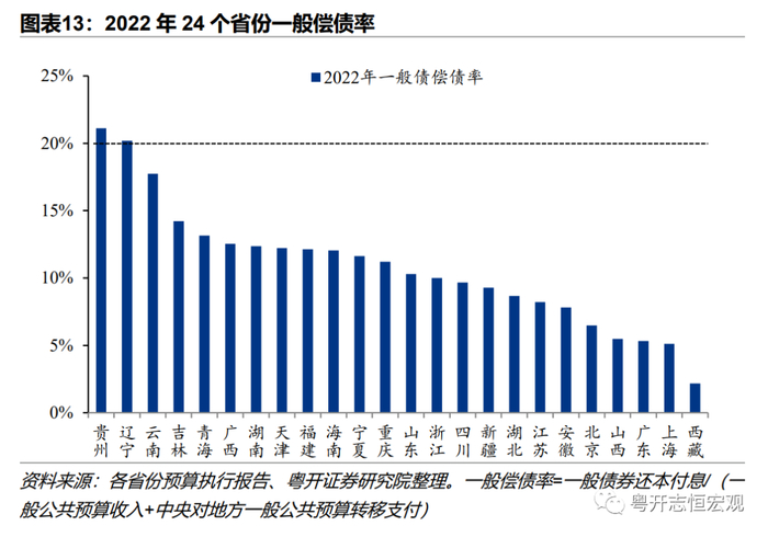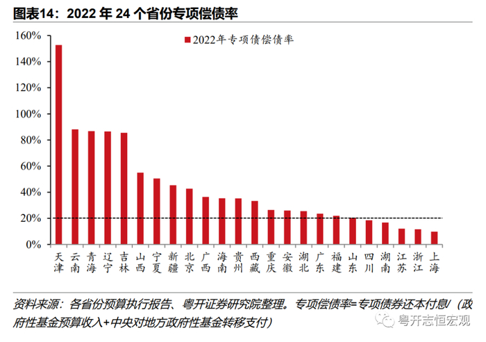 4、从还本付息来看,专项债偿债压力较高。地方债还本资金主要来自于再融资,“借新还旧”较为普遍,因而付息支出对地方财政的压力相对更大。2022年,江苏、山东、浙江、广东地方债还本付息支出超2000亿元,还本支出全国最高的是江苏(2080亿元),付息支出最高的是广东(769亿元)。偿债率指标方面,受限于数据可得性,河北、黑龙江、甘肃、江西4省无法计算综合财力,其他27个省份可计算综合偿债率;又因为内蒙古、河南付息数据明细以及陕西还本数据明细暂缺,剩下24个省市区可分别计算一般偿债率与专项偿债率。2022年综合偿债率高于20%的省份有5个,分别是天津(32.9%)、辽宁(25.8%)、贵州(25.1%)、云南(24.2%)和吉林(20.7%)。2022年仅有贵州、辽宁两省一般偿债率超过20%,分别为21.1%和20.2%,总体来看一般债务还本付息压力不大。2022年全国土地出让收入普遍下行,29个省份地方政府性基金收入负增长,导致专项偿债压力加剧。19个省份专项偿债率超过20%,其中天津专项偿债率超150%,云南、青海、辽宁、吉林、山西和宁夏专项偿债率超过50%,分别达到88.1%、86.8%、86.5%、85.5%、55%和50.6%,专项债务还本付息压力较大。