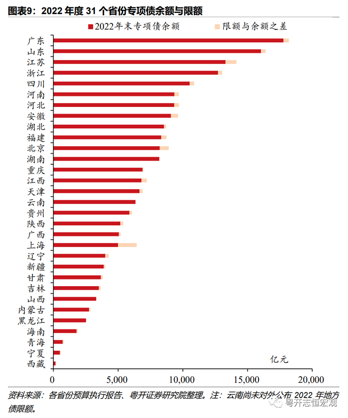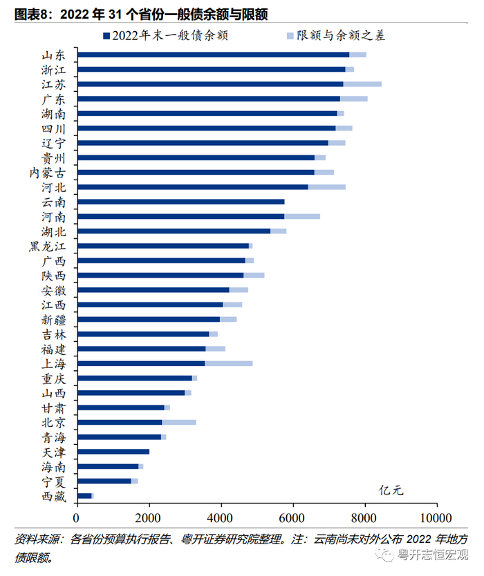 2、从债务限额来看,上海、江苏等地结存限额用以举债的空间较大。截至2022年末,31省份地方债限额与余额之差合计超2.2万亿元(云南省尚未披露2022年末地方债限额)。分地区来看,上海(2765)、江苏(1900)、北京(1637)、河北(1410)、河南(1330)、广东(1176)、安徽(1067)七个省市的限额空间超1000亿元,黑龙江、重庆债务余额与限额最为接近,举债空间不足。分类型来看,一般债限额空间1.35万亿元,专项债限额空间达0.85万亿元,一般债限额空间排名前三的依次是上海(1326)、江苏(1061)、河北(1044.8),专项债限额空间排名前三的依次是上海(1438)、江苏(839)、北京(692)。去年11月开始中央提前下达2023年专项债限额,实际可用于今年的地方债额度将会更高。