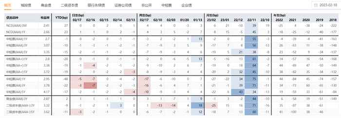上周利率和信用表现分化,整体仍呈现信用强于利率,信用利差延续近期的压缩态势。利率债方面,除了1Y期限由于资金面的边际收敛,收益率小幅上行2-5bp,其余期限周内基本在1bp左右窄幅波动,全周收益率基本呈现了“一”字形的窄幅波动走势,曲线走平。信用方面,本周中低评级(AA+&AA)以及中长久期(2-5Y)表现强于中高等级短久期券种,信用利差以及等级利差均继续压缩。