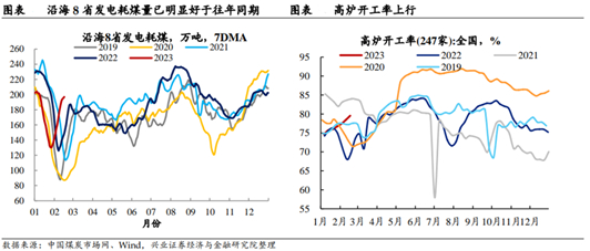 工业生产和建筑施工终端需求加速回暖。从工业生产的角度来看,本周沿海8省发电耗煤量继续大幅回升,已明显好于往年同期水平;高炉、汽车轮胎等绝大部分开工率数据也均有明显上行;从建筑施工的角度来看,本周全国项目开复工率同比去年回升 6.9 个百分点,明显好于前周水平。