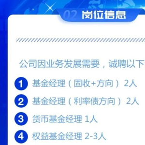 从招聘要求来看,银河基金要求应聘相关基金经理岗的人选需符合硕士及以上学历,金融、财务等相关专业等要求。具体来看,对于固收+基金经理和利率债基金经理,银河基金要求要有2年以上相关业绩证明;对于货币基金经理则要求不低于2年的货币市场基金或固收类资管计划管理工作经验,历史管理规模不低于50亿元。