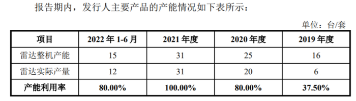 招股书显示,2019年、2020年、2021年和2022年上半年,公司的雷达整机产能分别为16台/套、25台/套、31台/套和12台/套,雷达实际产量分别为6台/套、20台/套、31台/套和12台/套,产能利用率分别为37.50%、80.00%、100.00%和80.00%;同时,公司的雷达整机的产销率也在逐年下降,由2019年的166.67%下滑至2022年上半年的41.67%。