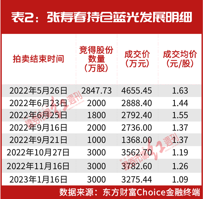 实际上,张寿春在持仓蓝光发展上进行了多次波段操作。据统计,张寿春首次建仓蓝光发展是在去年5月底,当时张寿春竞得公司在拍卖的2847.73万股,斥资4655.45万元。此后,在去年6月下旬、9月中旬等多个时间节点,张寿春均成功竞得了蓝光发展被司法拍卖的股权,但截至去年三季度末,其持股数量仅有2000.00万股,由此可见,张寿春在竞得司法拍卖的股份后不久就进行抛售。截至目前,公开资料显示,张寿春累计竞得了蓝光发展1.86亿股,累计斥资2.51亿元(见表2)。