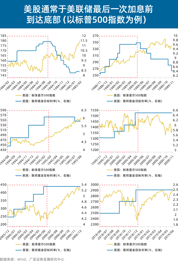 而对全球主要股票市场来说,其走势多数与美联储加息呈负相关,通常在美联储最后一次加息前后触底回升,并在加息结束后持续上涨。参考历史来看,以美股为例,在第一、三、六轮加息末期时,标普500指数呈触底回升走势,第五轮加息末期亦呈先降后升走势。