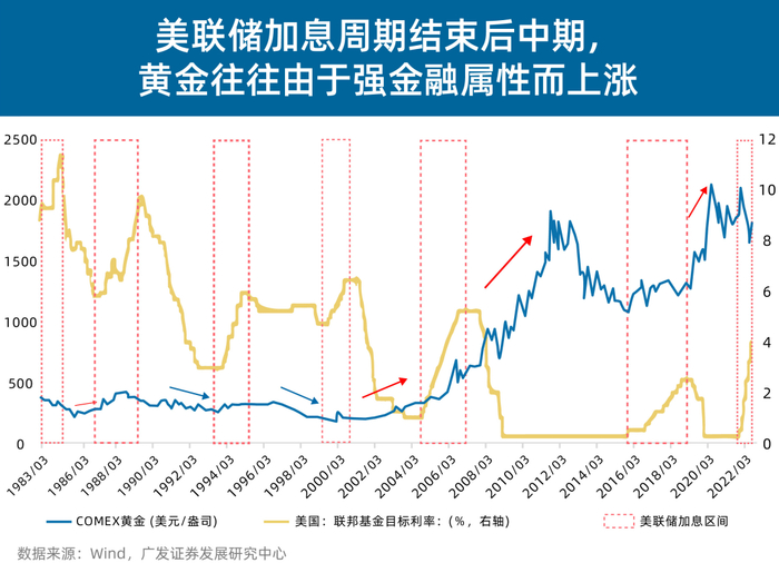 但在加息结束后中期,在全球经济加速下行导致需求衰退边际压力增大、金融条件并无进一步超预期改善的情况下,大宗商品价格便会转为以商品属性为主导,铜、原油等全球定价的商品往往会迎来下跌区间,而金融属性更强的黄金,则通常会在加息结束后的中期因金融条件改善而继续上涨。