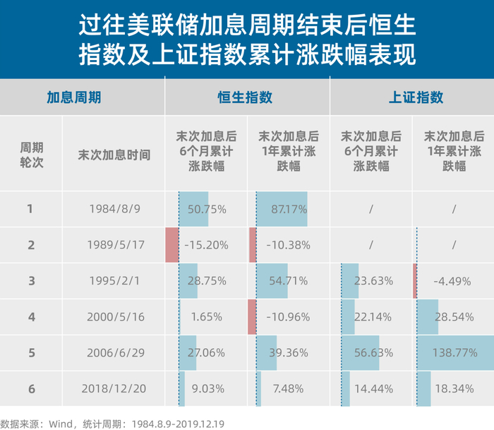 注:第一轮加息周期:1983.3.31-1984.8.9;第二轮加息周期:1987.1.5-1989.5.17;第三轮加息周期:1994.2.4-1995.2.1;第四轮加息周期:1999.6.30-2000.5.16;第五轮加息周期:2004.6.30-2006.6.29;第六轮加息周期:2015.12.17-2018.12.20。指数过往业绩不预示其未来表现,也不构成对基金业绩表现的保证。