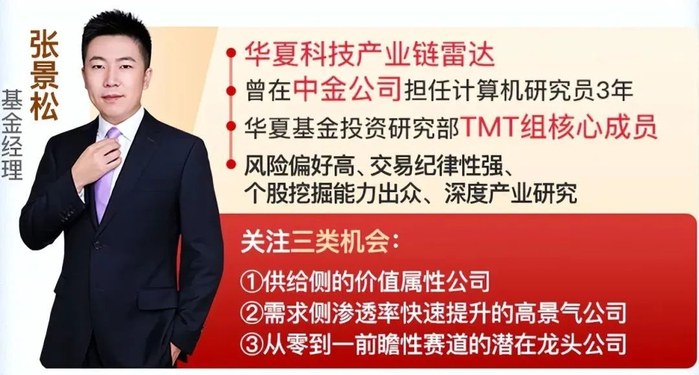 华夏数字经济龙头基金经理张景松,深耕数字经济领域8年,2015~2018年中金公司担任计算机行业研究员,2018年加入华夏基金后担任科技硬件研究员,是TMT组核心成员之一,主要研究方向包括半导体、智能电动车、智能制造、智慧能源、新材料、软件等。