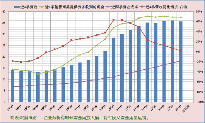 绿色折线接近或高于蓝色柱图上边显示营业收入含金量高。