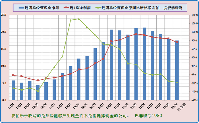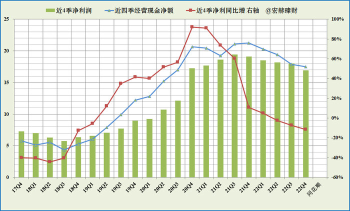 蓝色折线持续在绿色柱图上边及以上显示净利润含金量高。